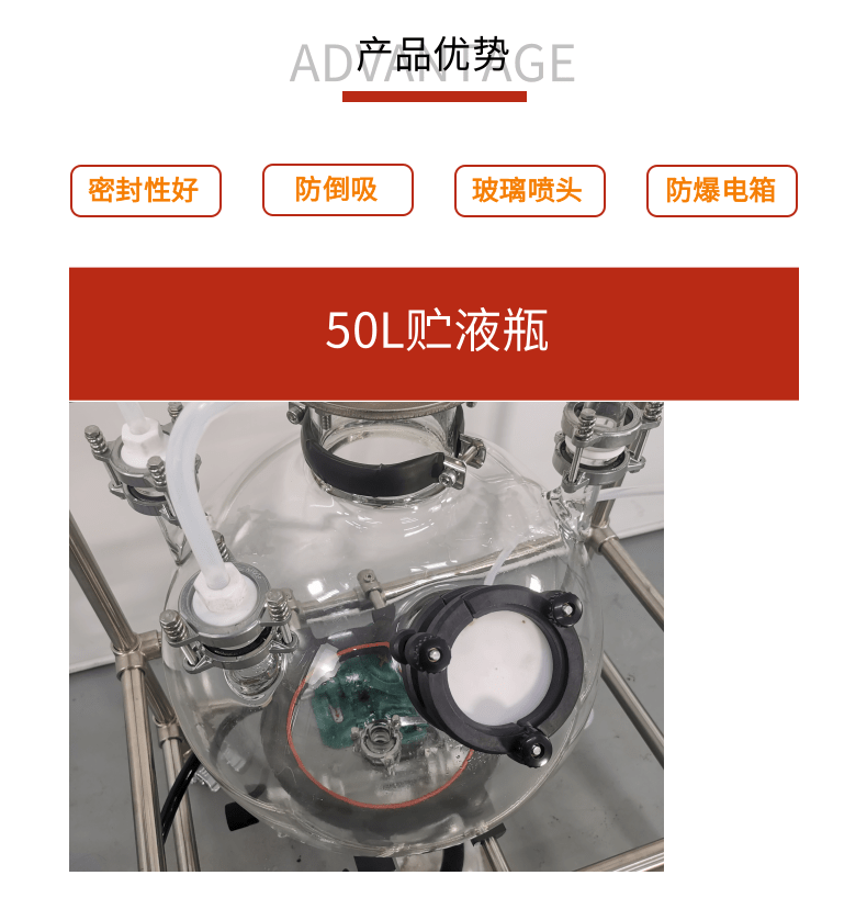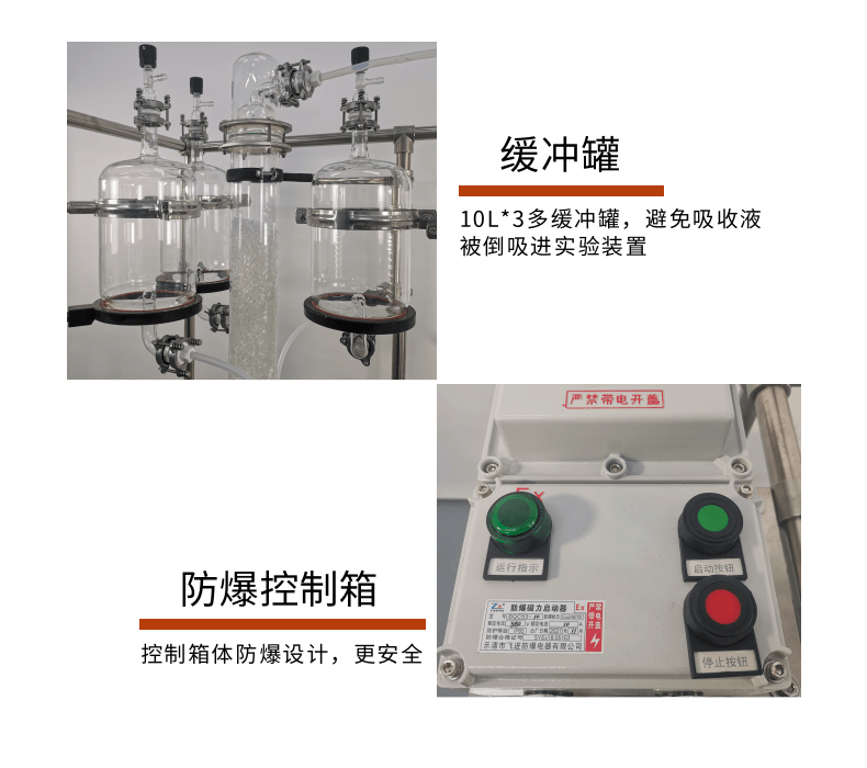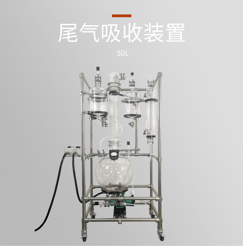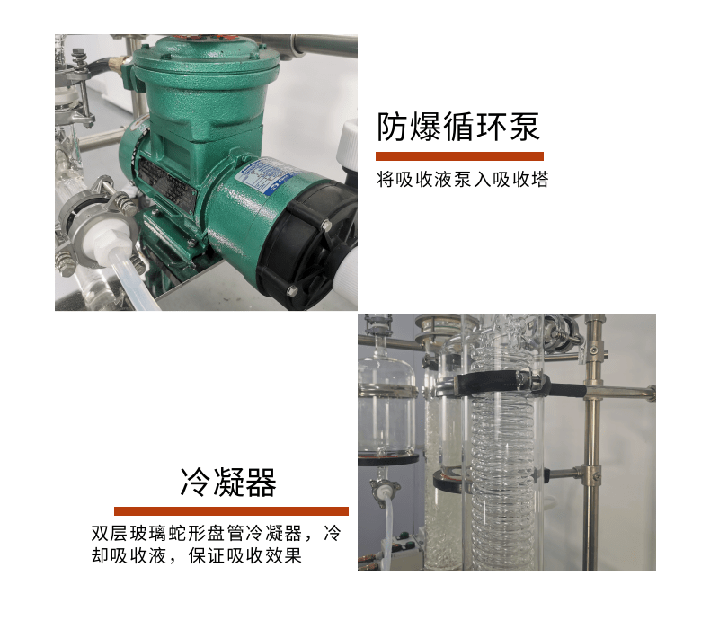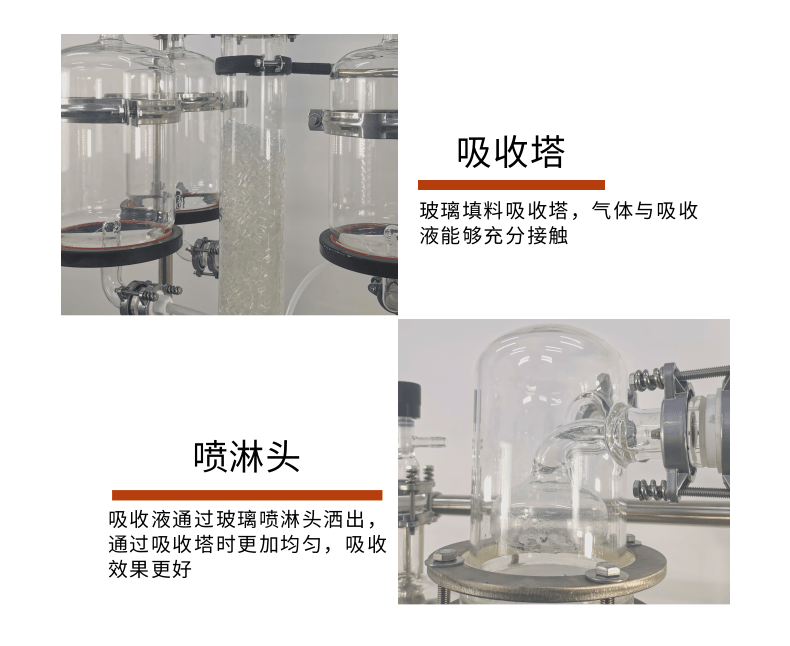 本款防爆尾氣吸收,配備三個(gè)防倒吸罐。磁力循環(huán)泵將吸收液從圓底燒瓶打入噴淋頭,從頂部落下。廢氣反方向進(jìn)入吸收柱,兩者充分接觸后,快速達(dá)成凈化。