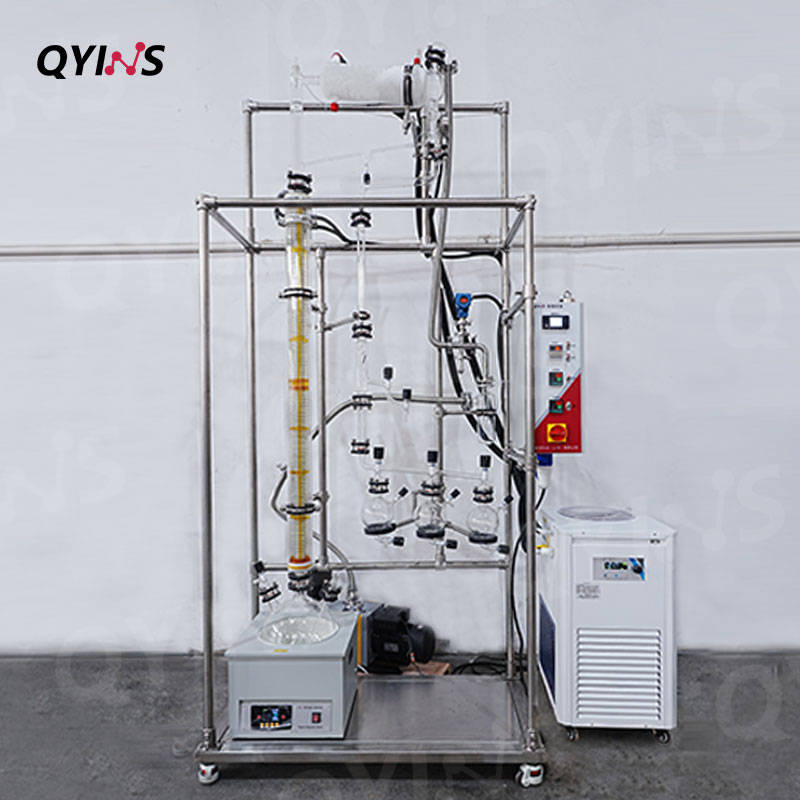 實驗型精餾塔,釜搭配磁力攪拌電熱套,塔柱為三層玻璃電加熱保溫,電磁鐵選用夾套形式,通制冷介質(zhì)可有效避免因回流比設(shè)置過小電磁鐵發(fā)熱的情況,搭配油泵整機真空可達10pa 以內(nèi),適用于多種物料實驗。